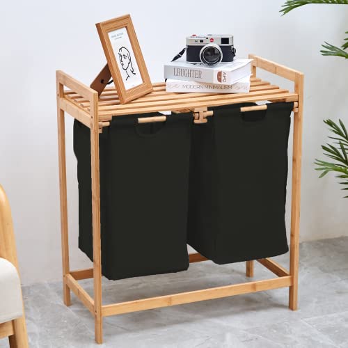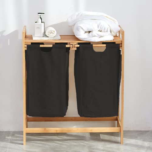 Organize Kosz na bieliznę z bambusa – 2 przegródki 30 l z tkaniny – Kosz łazienkowy – Pojemnik do przechowywania pralni – 64x33x73cm – Czarny