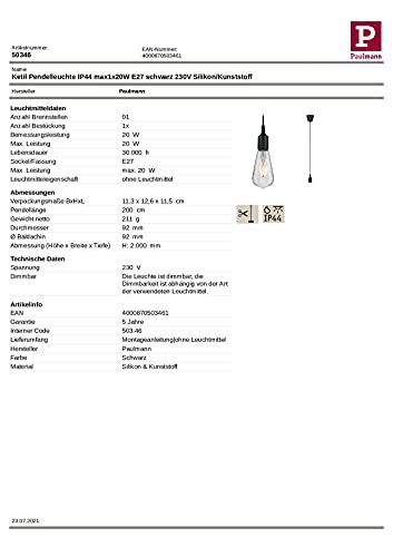 Paulmann 50346 opr.wisząca Neordic Ketil 1-ognisk. IP44 zabezp. przed wodą trysk. maks. 20 W lampa wisząca czarna lampa sufitowa silikon, tw. szt.E27