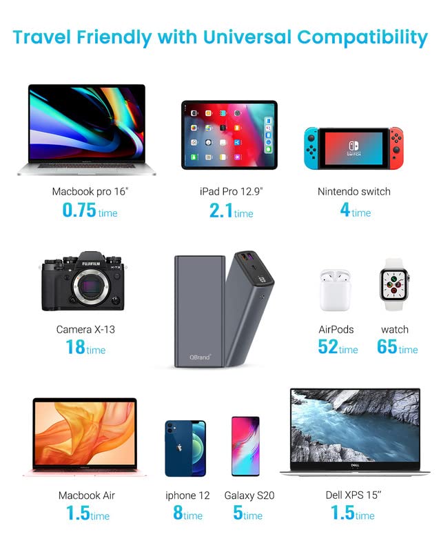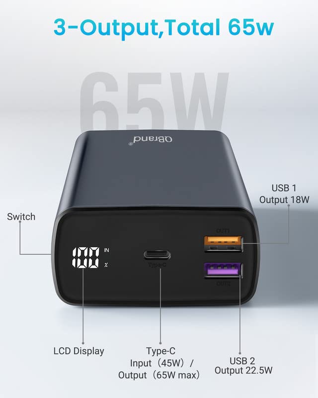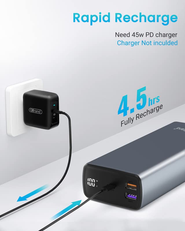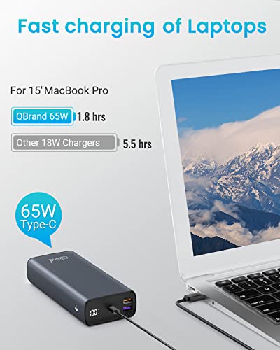 QBrand Power Bank 65 W 30 000 mAh, szybka ładowarka do laptopa, Power Bank USB C QC 3.0 Power Delivery 3 wyjścia i wyświetlacz LED zewnętrzny akumulator z do MacBook Pro, Dell, Lenovo, Samsung, Huawei, iPhone