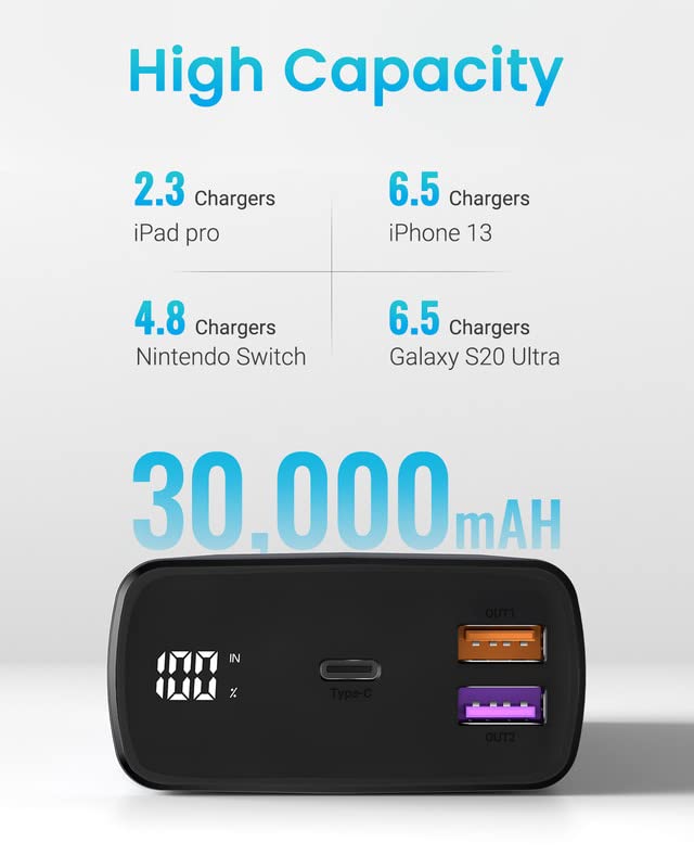• 【Duża pojemność 30000 mAh】Zewnętrzny przenośny powerbank o dużej pojemności 3000 mAh może w pełni naładować telefon co najmniej 6-8 razy. (2,3 razy do iPada Pro, 10,6 razy do iPhone’a 12 i 1 raz do 13-calowego MacBook Pro). Wysoka pojemność 3000 mAh nadaje się do codziennej aktywności i podróży służbowych.