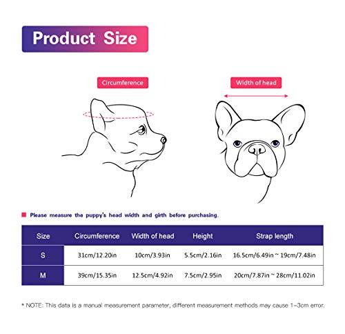 • 【2 Analiza rozmiaru】 【Rozmiar M】 pasuje na psa o szerokości głowy 12,5 cm / 4,5 „i obwodzie 39 cm / 15,4”, długość paska ≤ 28 cm / 11 „. 【Rozmiar S】 pasuje na psa o szerokość głowy 10 cm / 3,5 „i obwód 31 cm / 12,2”, długość paska ≤ 19 cm / 7,5 „. Przed zakupem należy zmierzyć szerokość i obwód głowy szczenięcia.