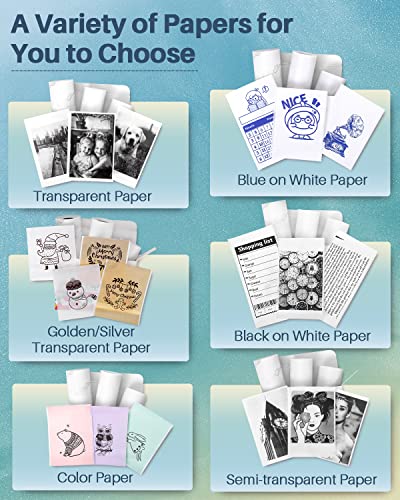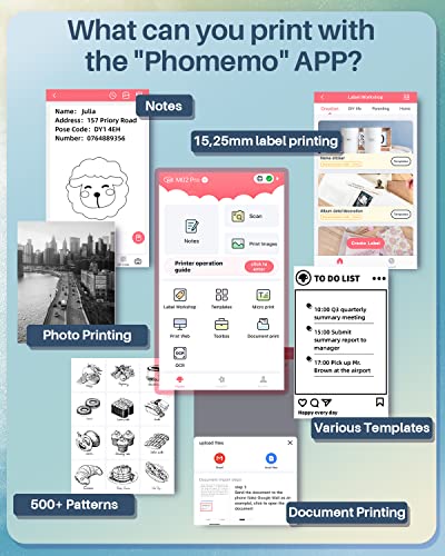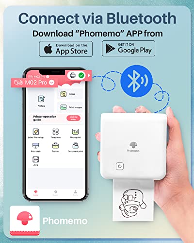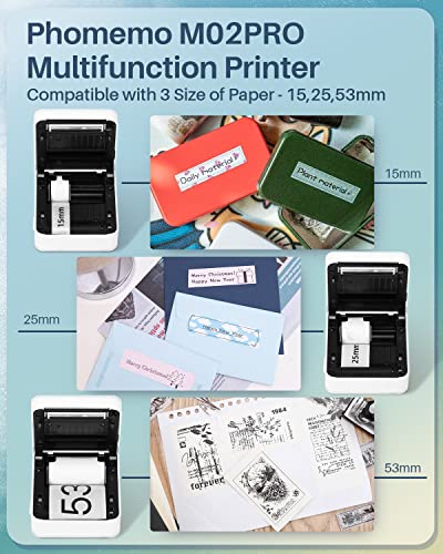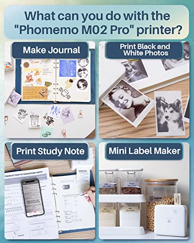• Wielofunkcyjna mini drukarka – przenośna drukarka termiczna M02Pro jest kompatybilna z trzema formatami papieru: 15 mm, 25 mm, 53 mm. Możesz drukować piękne czarno-białe zdjęcia i mogą być również używane jako urządzenie do etykietowania w domu lub w biurze, aby dopasować etykiety w aplikacji Phomemo.