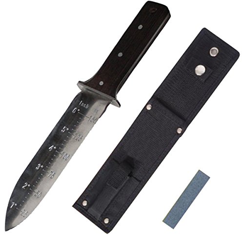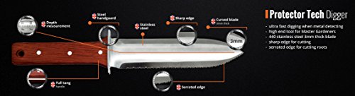 PRAKTYCZNE I FUNKCJONALNE NARZĘDZIE: digger ProtectorTech niezawodny podczas poszukiwania metalu a także w ogrodzie, w lesie, na biwaku czy na rybach. Doskonale sprawdzi się przy wykonywaniu różnych zadań, takich jak kopanie, pielenie, spulchnianie gleby, sadzenie, przesadzenie itd.DWA OSTRZA: jedno z nich to piłka idealna do cięcia np. korzeni, natomiast drugie ostrze posiada krawędź tnącą ostrą jak brzytwa. Zaokrąglone krawędzie, i dobre wyważenie noża sprawiają, że wykonywane czynności nie wymagają użycia dużego nakładu siły.OPTYMALNY ROZMIAR: długość całkowita 30,5 cm, ostrze 17,8 cm, grubość 3 mm. Ostrze wykonane ze stali nierdzewnej 440, a rękojeść z drewna.WIELOFUNKCYJNY: najlepsza pomoc przy wykrywaniu metalu, polowaniu, wędkowaniu i pracach ogrodowych ogrodników. Zastępuje takie narzędzia jak szufelka, łopata, szufelkę czy nóż, jeśli potrzebujesz tylko mocnego i ostrego ostrza, z gładkim i ząbkowanym ostrzem.PRAKTYCZNA KABURA: w zestawie solidny pokrowiec wykonany z cordury