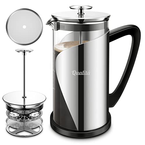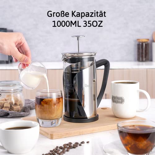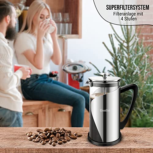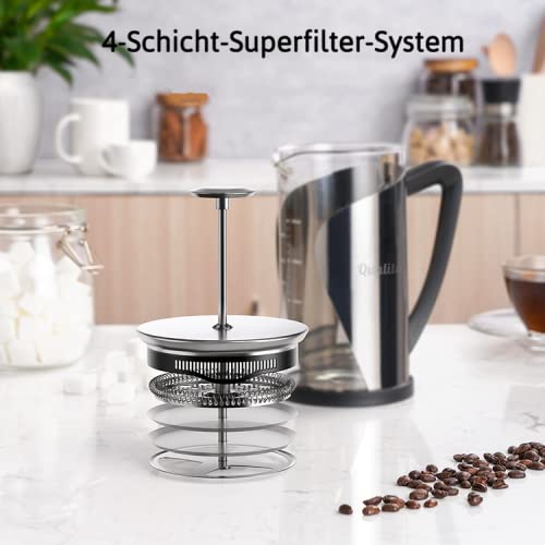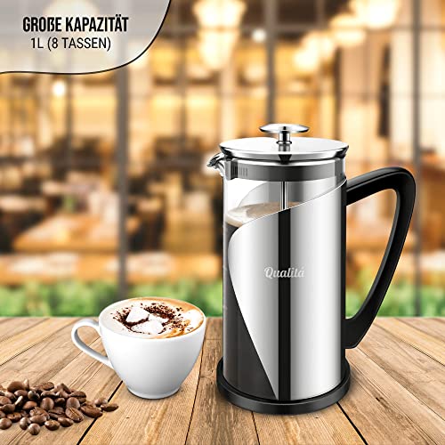 Qualitá French Press Kaffeemaschine | Grau French Press 1 Liter | Camping Kaffeemaschine | Großes Fassungsvermögen | Kaffeepresse mit vier Edelstahl Filtern | Coffee Press |