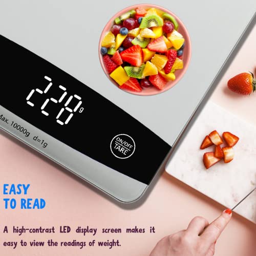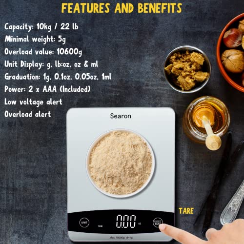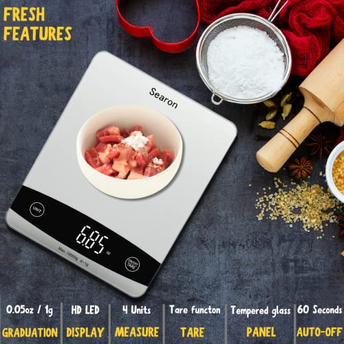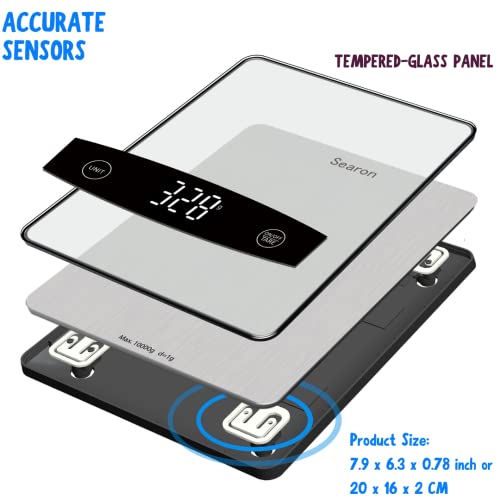 Searon Cyfrowa waga kuchenna do żywności, wielofunkcyjna waga do uncji żywności i gramów ml Lb, pojemność 10 kg na utratę wagi, pieczenia, gotowania, keto i przygotowywania posiłków, panel ze szkła hartowanego (kolor srebrny)