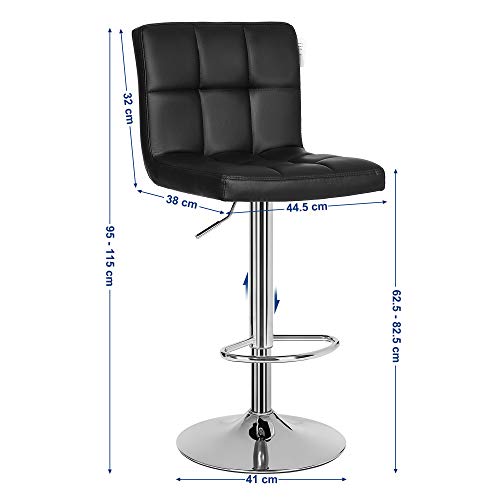 Einzelheiten: Produktdetails:- Farbe: Schwarz- Material: PU-Kunstleder, verchromter Stahl, Schaumstoff- Größe: 38 x 44,5 x (95-115) cm ( L x B x H)- Höhe der verstellbaren Sitzfläche: 62,5-82,5 cm- Maße Sitzfläche: 38 x 44,5 cm (L x B)- Höhe Rückenlehne: 32 cm- Durchmesser Sockel: 41 cm- Nettogewicht: 7,8 kg- Max. Belastbarkeit pro Barhocker: 200 kg Lieferumfang:- 2 x Barstuhl- 1 x Behälter mit Zubehör- 1 x Anleitung (DE, EN, FR, ES, IT)
