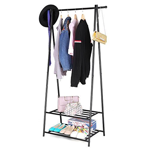 SONGMICS wieszak na ubrania, wieszak na płaszcze, szafa, 2 półki na buty i pudełka, metalowa rama, oszczędność miejsca, idealny do sypialni, przedpokoju i biura, czarny HSR05B