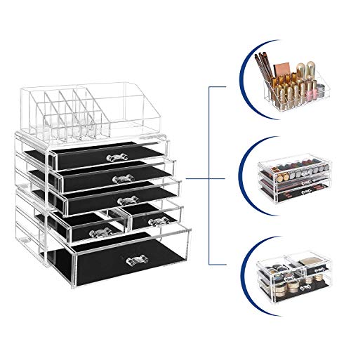 SONGMICS Organizer do makijażu, organizer na kosmetyki z 6 szufladami i 15 przegródkami w różnych rozmiarach, przezroczysty JKA009TP