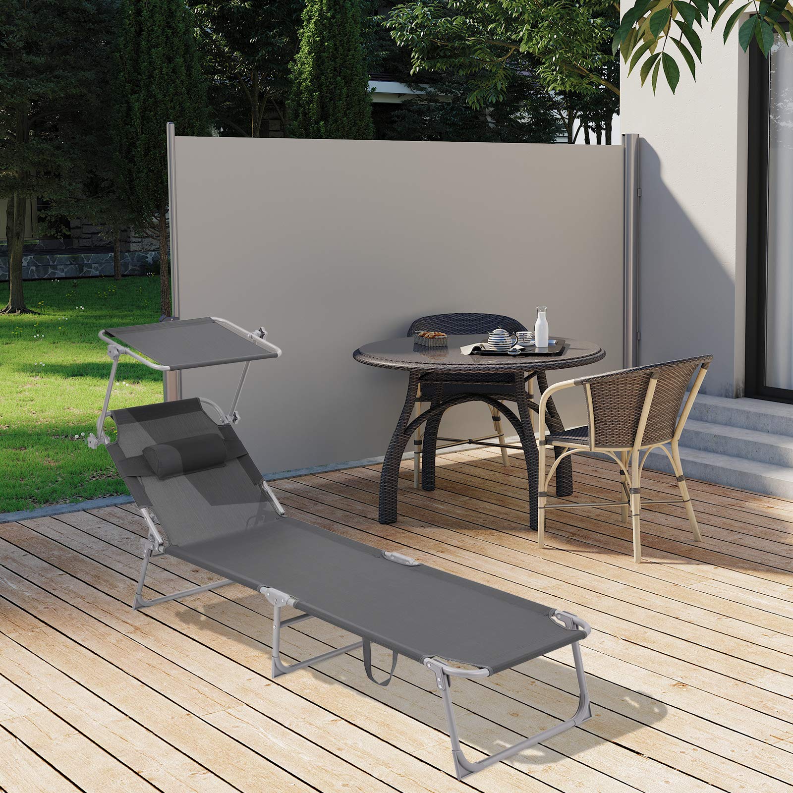 ✅ Leżak jest wyposażony: Leżak jest wyposażony w parasol przeciwsłoneczny, który umożliwia czytanie czasopism bez oślepiania podczas rozkoszowania się słońcem na dziedzińcu