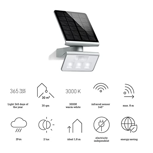 Steinel Solar-Außenleuchte XSolar L-S silber, 140° Bewegungsmelder, 8 m Reichweite, für Garten, Terrasse und Hauswand, 18.9 x 18.65 x 29.8 cm