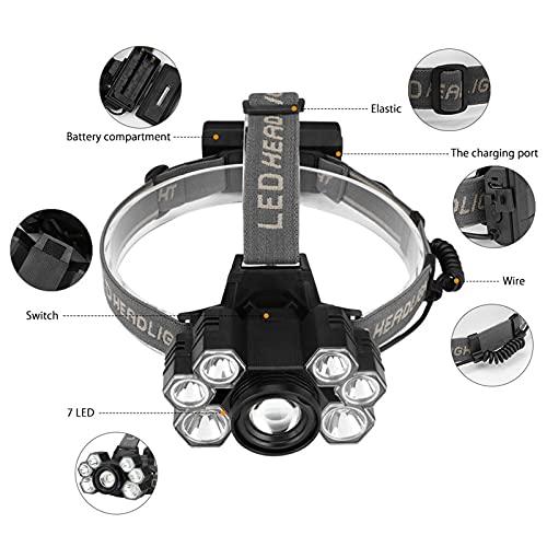 Lampa czołowa, ładowana przez USB, regulacja 90°, 7 diod LED, super jasna, 5 poziomów jasności, do aktywności na świeżym powietrzu, na kemping, wędrówki, wędkowanie, przygody