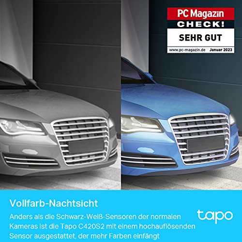 Pełnokolorowa widoczność w: Pełnokolorowa widoczność w nocy – w przeciwieństwie do czarno-białych czujników normalnych aparatów, Tapo C420S2 jest wyposażona w czujnik o wysokiej rozdzielczości, który rejestruje więcej kolorów