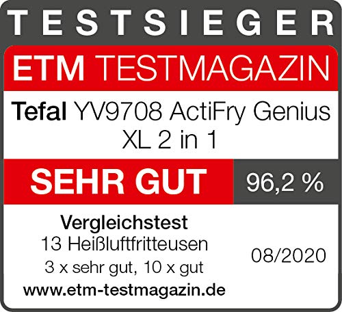 • Zawarto__ opakowania Tefal YV9708 ActiFry Genius XL 2 w 1, wyjmowana miska i blacha do pieczenia, zdejmowana pokrywka, miarka, instrukcja obs_ugi