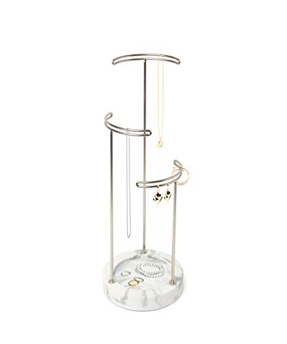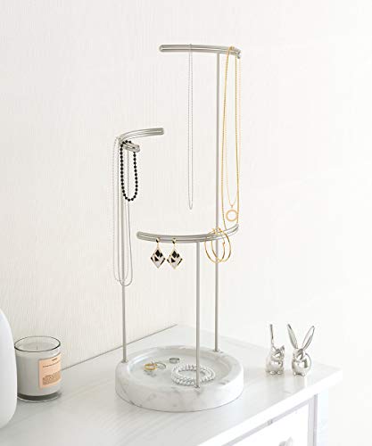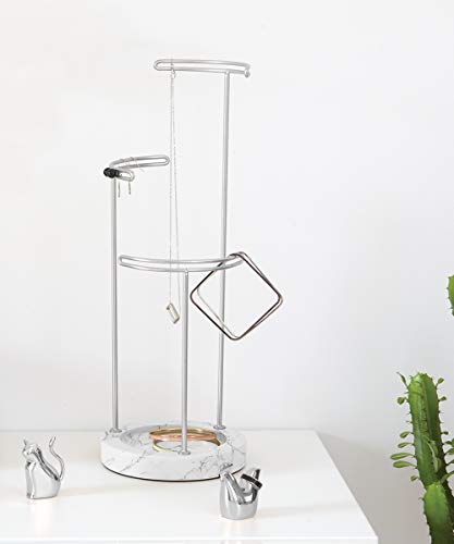 - MODERNES DESIGN: Seine außergewöhnlichen Materialien lassen den Tesora Schmuck Ständer nicht nur schön aussehen, sich machen ihn auch zu einer sehr funktionalen Ketten Aufbewahrung; seine silberfarbenen Metallstangen und die weiß, marmorierte Ablageschale aus Kunstharz machen ein starkes Statement