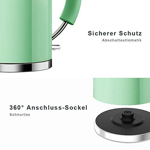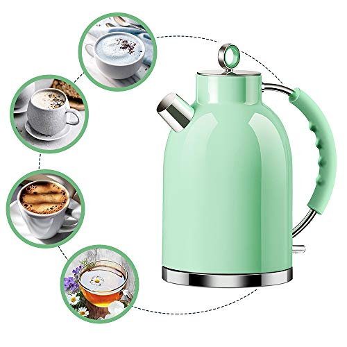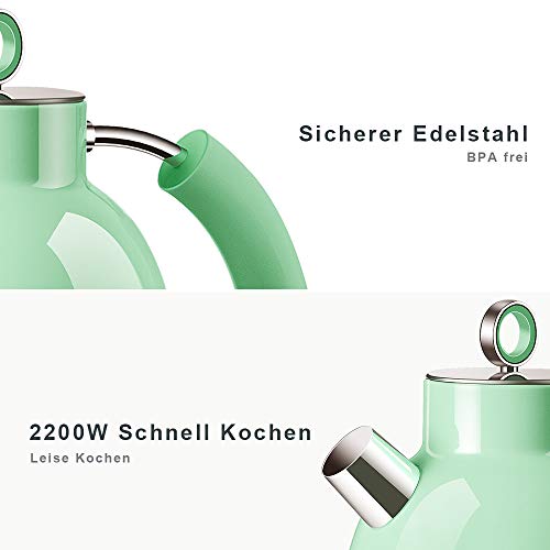 Wasserkocher Edelstahl, ASCOT Elektrischer Wasserkessel, 2200 W, 1,6 liter, Retro Design, kabelloser Teekocher, BPA frei, Trockengehschutz, automatische Abschaltung, (Grün)
