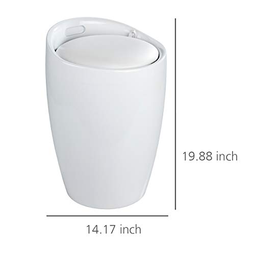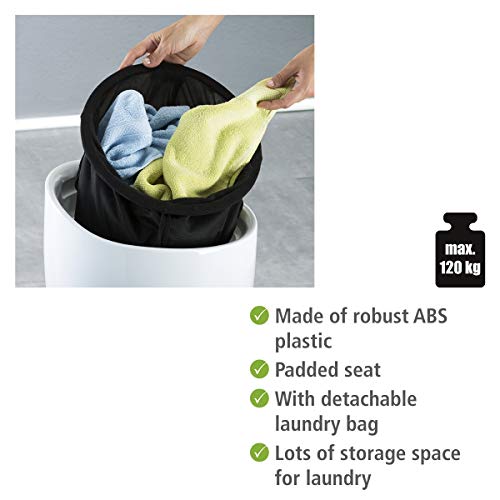 - Lieferumfang: 1 x Badhocker Candy, Hocker und Wäschesammler mit gepolstertem Deckel von WENKO, Hocker: ABS-Kunststoff; Wäschesack: 100% Polyester, BPA-frei, Fassungsvermögen 20 L, Ø 36 x 50,5 cm, Weiß