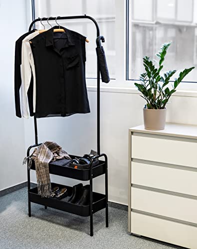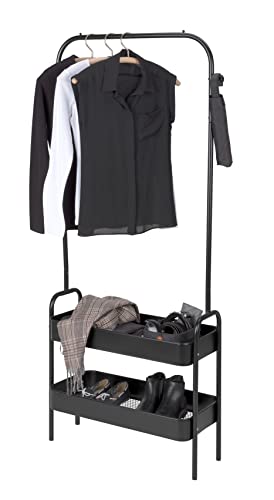 • Dużo miejsca do przechowywania: Praktyczny wieszak na ubrania oferuje drążek na ubrania do wielu wieszaków na ubrania lub garderoby. Dwa wbudowane małe stopery zapewniają, że zauszniki nie będą się zsuwać z zaokrąglonego drążka. W dwóch głębokich, przestronnych koszach zmieści się buty i akcesoria. Dwa dodatkowe haczyki po bokach służą do zawieszenia na przykład szali, toreb lub parasoli.