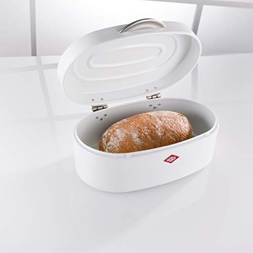 - Der Brotkasten Single Elly ist ein echtes Retro-Schmuckstück, denn mit seiner ovalen Form und der dekorativen Prägung im Deckel erinnert er an Brotkästen aus den 50er Jahren
