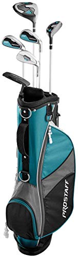• Zawartość: Wilson Golf Pro Staff JGI LG dla dziewcząt, Zestaw: 1 Sterownik, 1 hybryda 4, 2 żelazka, 1 koturn, 1 pojemnik do noszenia, w zestawie torba do noszenia / stojak dla praworęcznych, materiał: Grafit, kolor: Turkusowy, WGGC91860