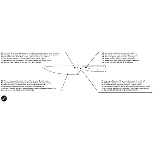 - Performance Cut: die Klinge wird in einem Spezialofen wärmebehandelt. Das Härteverfahren und ein lasergesteuerter Roboterschliff sorgen für einen optimalen Schleifwinkel. Das Messer bleibt länger scharf