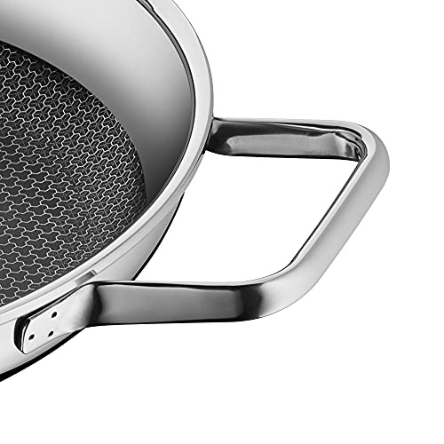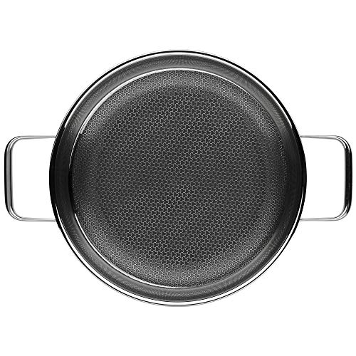 - Material: Mehrschichtmaterial (Cromargan Edelstahl, Aluminium-Kern, Außenseite Chromstahl). PTFE-Antihaftbeschichtung mit kratzfester Edelstahl-Wabenstruktur. Hitzebeständig und backofenfest bis 260°C