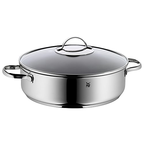 Einzelheiten: Produktbeschreibung Die WMF Schmorpfanne mit Deckel vereint die besten Eigenschaften einer Edelstahlpfanne mit denen eines antihaftversiegelten Modells: Aluminiumkern, rostfreier Edelstahl innen und extrem widerstandsfähiger Chromstahl außen. Zudem sorgt die beschichtete Bratfläche (ILAG Durit Antihaftbeschichtung) dafür, dass Ihnen so schnell nichts mehr anbrennt. Drehen Sie die Hitze voll auf – Edelstahl verträgt hohe Temperaturen – und Geflügel und andere Fleischstücke bekommen eine leckere Kruste. Brutzeln Sie drauflos! Hohe Pfanne: Dadurch, dass die Pfanne hoch ist, können problemlos auch Flüssigkeiten in der Pfanne erhitzt werden und rausspritzen wird verhindert. Die zeitlos schönen und dauerhaft glänzenden Edelstahlpfannen sind aus dem von WMF patentierten besonders widerstandsfähigen Cromargan gefertigt. Das hat gleich mehrere Vorteile: Cromargan ist äußerst robust und formstabil strapazierfähig beständig gegen Speisesäuren und absolut geschmacksneutral. Edelstahlpfannen sind besonders für scharfes Anbraten bei starker Hitze geeignet. Sie vertragen Temperaturen bis zu 250 °C.Bereiten Sie Ihre Mahlzeiten vor, kochen Sie leidenschaftlich und essen Sie in genussvollem Ambiente. Jedes Teil dieser sorgfältig zusammengestellten Serie ist einfach erstklassig und einzigartig. Die flexibel einsetzbaren und sammelfähigen Küchenaccessoires erfüllen höchste Qualitätsansprüche und sorgen für jede Menge kulinarisches Vergnügen rund ums Vorbereiten, Kochen und Essen. Markenbeschreibung Seit über 160 Jahren lebt die Marke WMF eine starke Tradition. Sie ist international präsent, setzt Maßstäbe und wirkt mit zahlreichen Innovationen im Markt als wichtiger Impulsgeber. Sie begleitet Genießer durch den Alltag mit qualitativ hochwertigen, funktionalen und formschönen Produkten rund um Tisch und Küche, die einem hohen Designanspruch genügen. Produktbeschreibung des Herstellers Für jeden Zweck die richtige Pfanne: eine versiegelte Pfanne ist ideal zum fettarmen und schonenden Garen von empfindlichem Bratgut oder Lebensmittel, die bei relativ niedrigen Temperaturen gebraten wird, wie Eier, Fisch, Paniertes etc. Nichts brennt an und nichts bleibt haften. Rechtliche Hinweise Kein rechtlicher Hinweis Set enthält: 1x Schmor-/ Servierpfanne beschichtet 28cm (Volumen 5,0l, Höhe 9 cm) optimal für Herdplatten mit Ø 22 cm, 1x Glasdeckel 28 cm