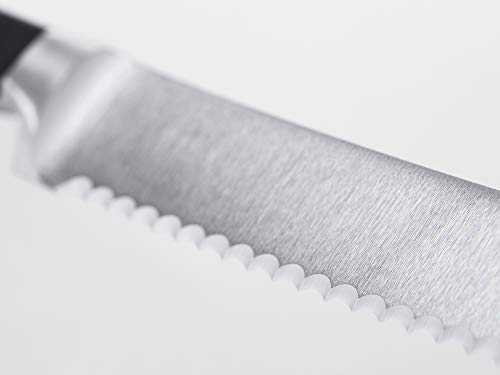 - Sägemesser: Mit hoher Schneidkraft gleitet das Wellenschliff-Messer mühelos durch weiches und hartes Brot. Auch knuspriger Braten, große Früchte mit fester Haut oder Gemüse lassen sich damit präzise zerteilen – ein nützliches Universalmesser
