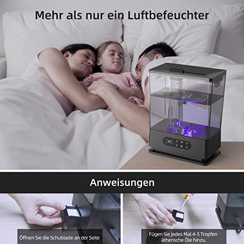 - (Kann ätherische Öle hinzufügen) Befeuchtungs- und Aromatherapiefunktion, Sie können 4 bis 5 Tropfen ätherische Öle gleichzeitig in die Aroma Box geben. Der zarte Wassernebel trägt das Aroma in jede Ecke des Raumes. Bitte tropfen Sie kein ätherisches Öl direkt in den Wassertank