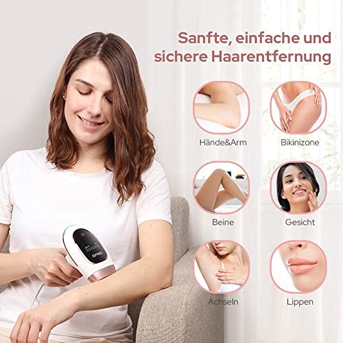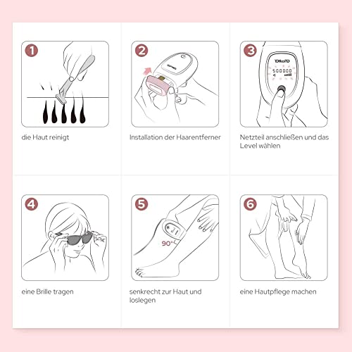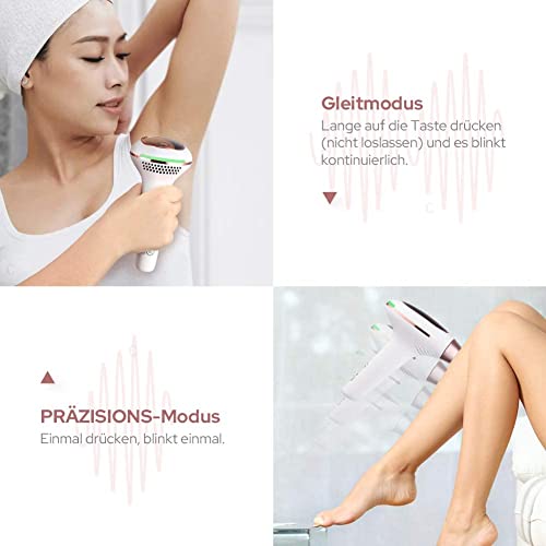 • 5 poziomów / dwa tryby IPL do usuwania włosów: 5 różnych poziomów energii, które umożliwiają użytkownikowi wybór koloru skóry i koloru włosów, aby zapewnić intensywne światło. Zacznij po raz pierwszy od poziomu 1, aby przyzwyczaić się do urządzenia i migać przed przejściem na wyższy poziom. Tryb precyzyjny jest automatyczny. Użytkownik może aktywować tryb ślizgowy. Przygotowaliśmy niemiecką instrukcję obsługi (może nie być dostępna w języku polskim)