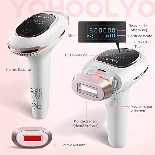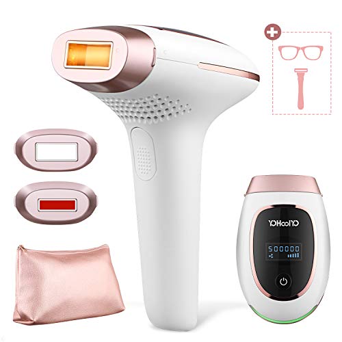 YOHOOLYO IPL urządzenie do depilacji 500 000 impulsów świetlnych, trwałe urządzenie IPL, w zestawie 2 specjalne nasadki do ciała, twarzy, strefy bikini i pach