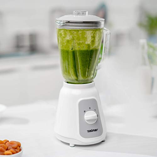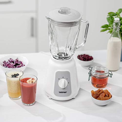 Zelmer ZSB4707 – Blender kielichowy z dzbankiem 1,50L, Mikser stojący, Wysokiej klasy blender o mocy 500W, odpowiedni do kruszenia lodu i koktajli, Funkcja Plus, 4 ostrzy ze stali nierdzewnej, Biały.