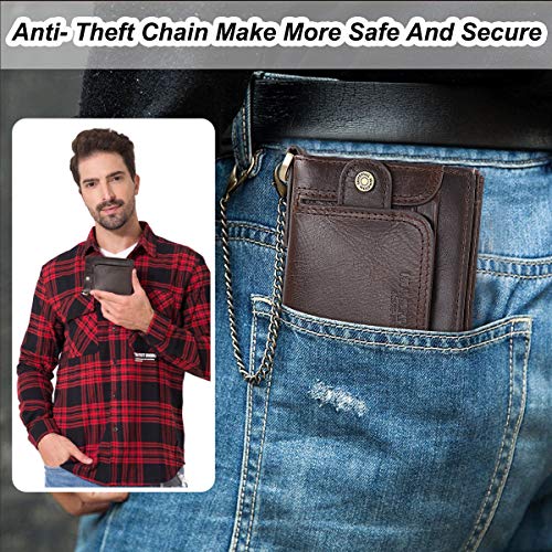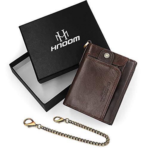 HNOOM Męski portfel blokujący RFID, portfel z prawdziwej skóry z łańcuchem, dwukrotne, wąskie portfele dla mężczyzn, 14 przegródek na karty i kieszeń na monety z zamkiem błyskawicznym, męskie skórzane portfele męskie, wąska torebka z pudełkiem prezentowym, Kawa, S, Vintage