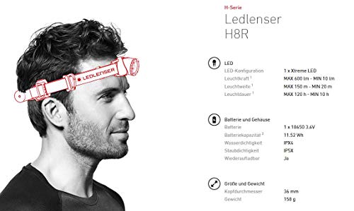 Ledlenser H8R Latarka czołowa LED, ładowany akumulator litowy typu 18650, 600 lumenów, z możliwością ustawiania ostrości, czas pracy do 120 h, tylne światło czerwone, obrotowa, kabel USB do ładowania