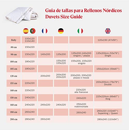 - Es handelt sich um zwei Einzeldecken, die auf drei unterschiedliche Weisen kombiniert werden können: 150 g für warme Raumtemperaturen, Frühling/Sommer und Räume mit Zentralheizung, 300 g für mittlere und kalte Raumtemperaturen oder für Herbst/Winter, zusammen als dicke Bettdecke (450 g) für sehr kalte Nächte im Herbst/Winter.