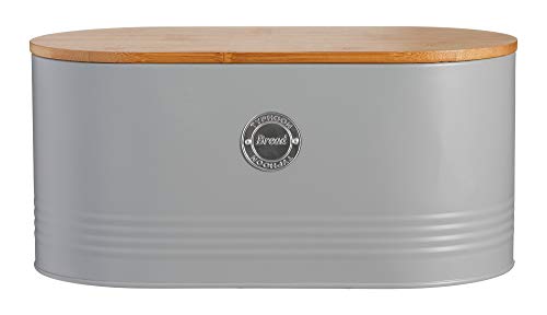 ✅ Pojemnik na chleb: Pojemnik na chleb | Living Grey chlebak jest idealny do organizowania świeżych wypieków na blacie. Subtelny pastelowy szary doskonale uzupełnia srebrna plakietka „chleb”, która dodaje elegancji dodatkowi. Bambusowa pokrywka pozyskiwana w sposób zrównoważony może służyć jako deska do krojenia lub prz