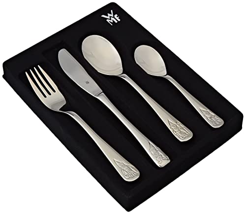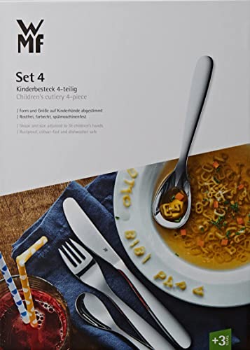Einzelheiten: Produktbeschreibung Mit dem Kinderbesteck von WMF lernen die Kleinen spielerisch, mit Messer, Löffel und Gabel umzugehen. Mehr als 125 Jahre Erfahrung stecken in den kindgerechten Besteckteilen aus rostfreiem Edelstahl, die außerdem mit liebevoll gestalteten Motiven und farbigen Bildern begeistern. Das 4-teilige WMF Kinderbesteck, bestehend aus einem Kindermesser, einem großen und kleinen Kinderlöffel sowie einer Kindergabel, zeichnet sich durch ein kindgerechtes Design aus, das die Fähigkeit zum selbständigen Essen verbessert und gleichzeitig für Spaß beim täglichen Essen sorgt. Die Kinderbesteckset sind in entsprechende Altergruppen eingestuft, dieses eignet sich für Kinder ab 3 Jahren. Die Größe und Form dieser Kinderbesteckteile machen dieses Set zum perfekten Erstbesteck für absolute Sicherheit und die Entwicklung der Feinmotorik. Die Größen der Besteckteile und die kräftigen Stiele eignen sich besonders für kleine Hände und die kindliche Motorik. Die Messer haben einen leichten Wellenschliff. Der Laffenrand des Löffels hat abgerundete Kanten, und die kurzen stumpfen Zinken der Kindergabel passen sich kleinen Kindermündern an. Die Besteckteile aus Cromargan Edelstahl Rostfrei 18/10 sind langlebig und können in der Spülmaschine gereinigt werden. Spülmaschinenfestes und säurebeständiges Cromargan garantiert vollen Geschmack, außergewöhnliche Haltbarkeit und eine elegante Ästhetik. Das 4-teilige Kinderbesteck wird in einer hochwertigen Faltschachtel mit Klappdeckel geliefert.HINWEIS: Das Kinderbesteck wird in einer hochwertigen Geschenkkarton mit allgemeiner Abbildung geliefert. Es wird nicht das innenliegende Besteck abgebildet! Verpackung erst öffnen und Inhalt prüfen! Markenbeschreibung Seit über 160 Jahren lebt die Marke WMF eine starke Tradition. Sie ist international präsent, setzt Maßstäbe und wirkt mit zahlreichen Innovationen im Markt als wichtiger Impulsgeber. Sie begleitet Genießer durch den Alltag mit qualitativ hochwertigen, funktionalen und formschönen Produkten rund um Tisch und Küche, die einem hohen Designanspruch genügen. Produktbeschreibung des Herstellers Wir bieten Ihrem Kind in jeder Phase des Groß-Werdens das Besteck, das in Größe und Proportionen zu ihm passt. Schon bei der Produktentwicklung berücksichtigen wir die Fähigkeiten, die Ihr Kind in seiner Altersstufe hat. Deshalb sind WMF Baby- und Kinderbestecke auf die motorischen, geistigen sowie emotionalen Phasen abgestimmt, vom Säugling bis zum Schulkind. Rechtliche Hinweise Kein rechtlicher Hinweis Set enthält: Kinder Besteck Set: 1x Kinder-Gabel, 1x Kinder-Messer, 1x Kinder-Löffel, 1x kleiner Löffel (Länge 16,5/18,5/16,5/13 cm) in Geschenkkarton