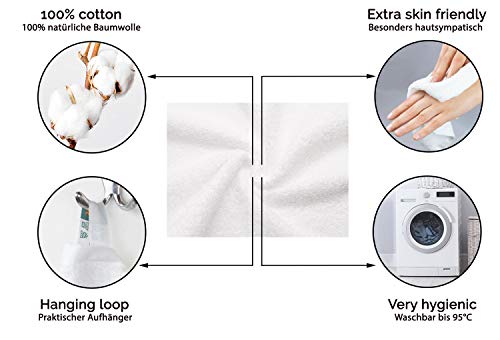 ✅ Wysokiej jakości materiał: Wysokiej jakości materiał – ręczniki z podwójnym szwem zabezpieczającym są wykonane w 100% z bawełny, która została wpleciona w miękki materiał frotte. Gramatura materiału wynosi ok. 450 g/m² i są wyposażone w praktyczny uchwyt do zawieszenia.